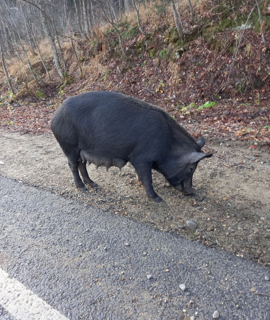 Утро. Направились на двух машинах в путь. На трассе нас поджидал сюрприз. Прям на дорогу вышла дикая кабаниха. Мы остановились. Я снимала, а девочки подкармливали. На другой стороне дороги, чуть ниже, тоже стояла машина и люди кормили других кабанчиков. Там даже детки выбегали.