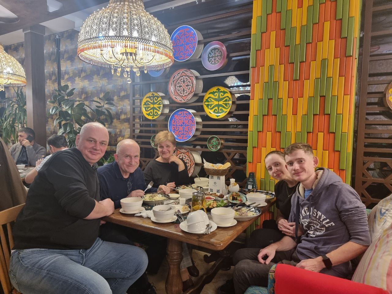 Порция бишбармака очень огромная, весом в 600 грамм, поэтому мы его убедили заказать две порции на четверых. Мясная нарезка, манты двух видов, ургенский плов, жареные пельмени и две порции шурпы дополнительно заказанные Анатолием привели нас всех в тихий ужас.