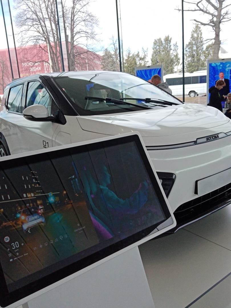 Огромная молекула атома и электромобиль, с его описанием устройства и использования, встречает всех гостей на входе в павильон.