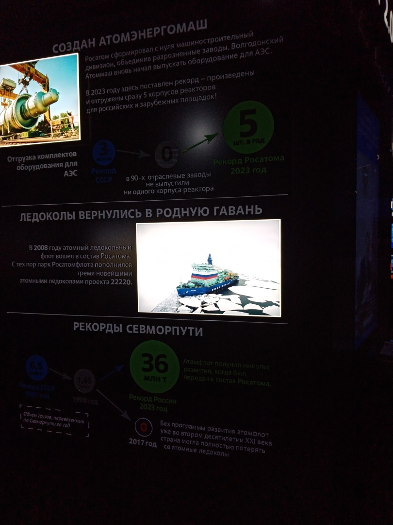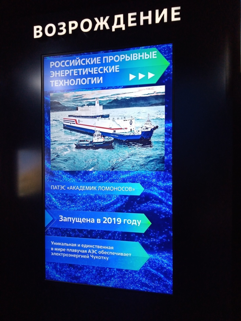 На стенах зала мы видим живые анимации атомного ледокола "Россия", его макет в увеличенном и в уменьшенном виде с описанием самого ледокола, его достижениях.