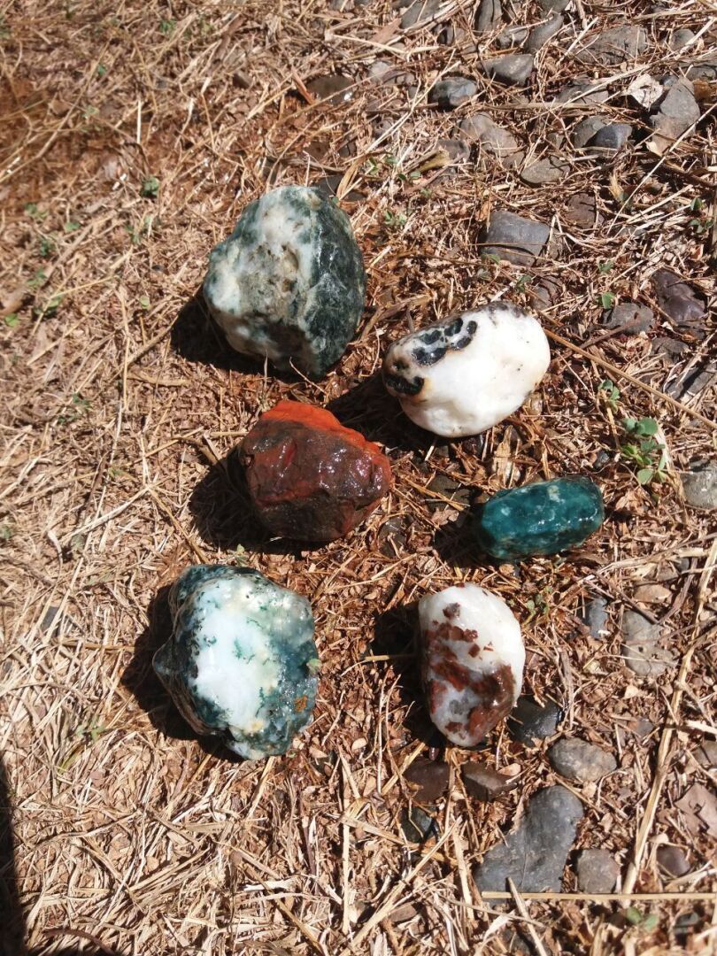 Я вижу халцедон и нефрит. Прекрасно. Белый с включениями - это халцедон. зеленый нефрит. Я могу ошибаться. Геологом был мой муж.