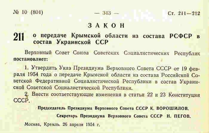 Мошкин: Официальная формулировка, замечу, гуляла из документа в документ, она очень лаконична, по-чиновничьи сформулирована, но достаточно содержательна. Эта формулировка из указа Президиума Верховного Совета о передаче Крымской области звучит следующим образом: «Учитывая общность экономики, территориальную близость и тесные хозяйственные и культурные связи между Крымской областью…» — и так далее. То есть даже эти слова, при всем их казенном звучании, на мой взгляд, достаточно точно отражают причину передачи: общность экономики, территориальная близость, хозяйственные связи. Версия о том, что это был подарок к 300-летию Переяславской рады, ни в одном официальном документе не звучала. Это уже версии и мифологемы.