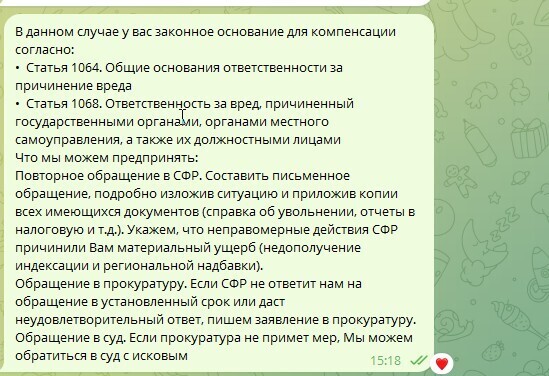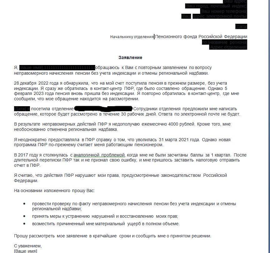 Повторное обращение в СФР. Составить письменное обращение, подробно изложив ситуацию и приложив копии всех имеющихся документов (справка об увольнении, отчеты в налоговую и т.д.). Укажем, что неправомерные действия СФР причинили Вам материальный ущерб (недополучение индексации и региональной надбавки).