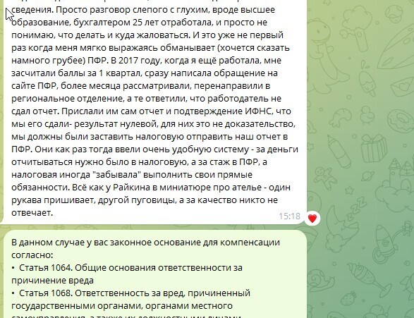 В 2017 году, когда я ещё работала, мне засчитали баллы за 1 квартал, сразу написала обращение на сайте СФР, более месяца рассматривали, перенаправили в региональное отделение, а те ответили, что работодатель не сдал отчет. Прислали им сам отчет и подтверждение ИФНС, что мы его сдали- результат нулевой, для них это не доказательство, мы должны были заставить налоговую отправить наш отчет в СФР. Они как раз тогда ввели очень удобную систему - за деньги отчитываться нужно было в налоговую, а за стаж в СФР, а налоговая иногда "забывала" выполнить свои прямые обязанности. Всё как у Райкина в миниатюре про ателье – один рукава пришивает, другой пуговицы, а за качество никто не отвечает".