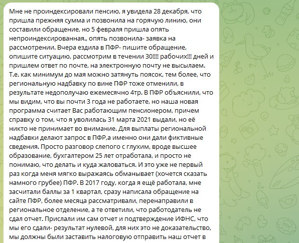 "Мне не проиндексировали пенсию, я увидела 28 декабря, что пришла прежняя сумма, и позвонила на горячую линию, они составили обращение, но 5 февраля пришла опять не проиндексированная, опять позвонила – заявка на рассмотрении. Вчера ездила в СФР – пишите обращение, опишите ситуацию, рассмотрим в течение 30 (!!!) рабочих дней и пришлем ответ по почте, на электронную почту не высылаем. Т.е. как минимум до мая можно затянуть поясок, тем более что региональную надбавку по вине СФР тоже отменили, в результате недополучаю ежемесячно 4000.