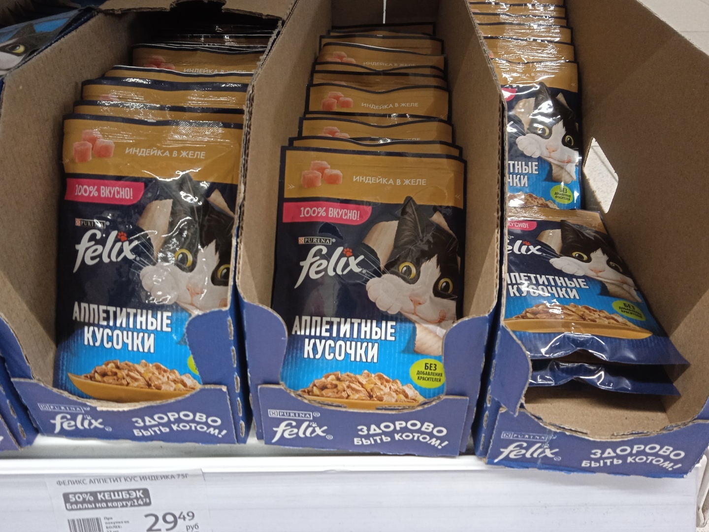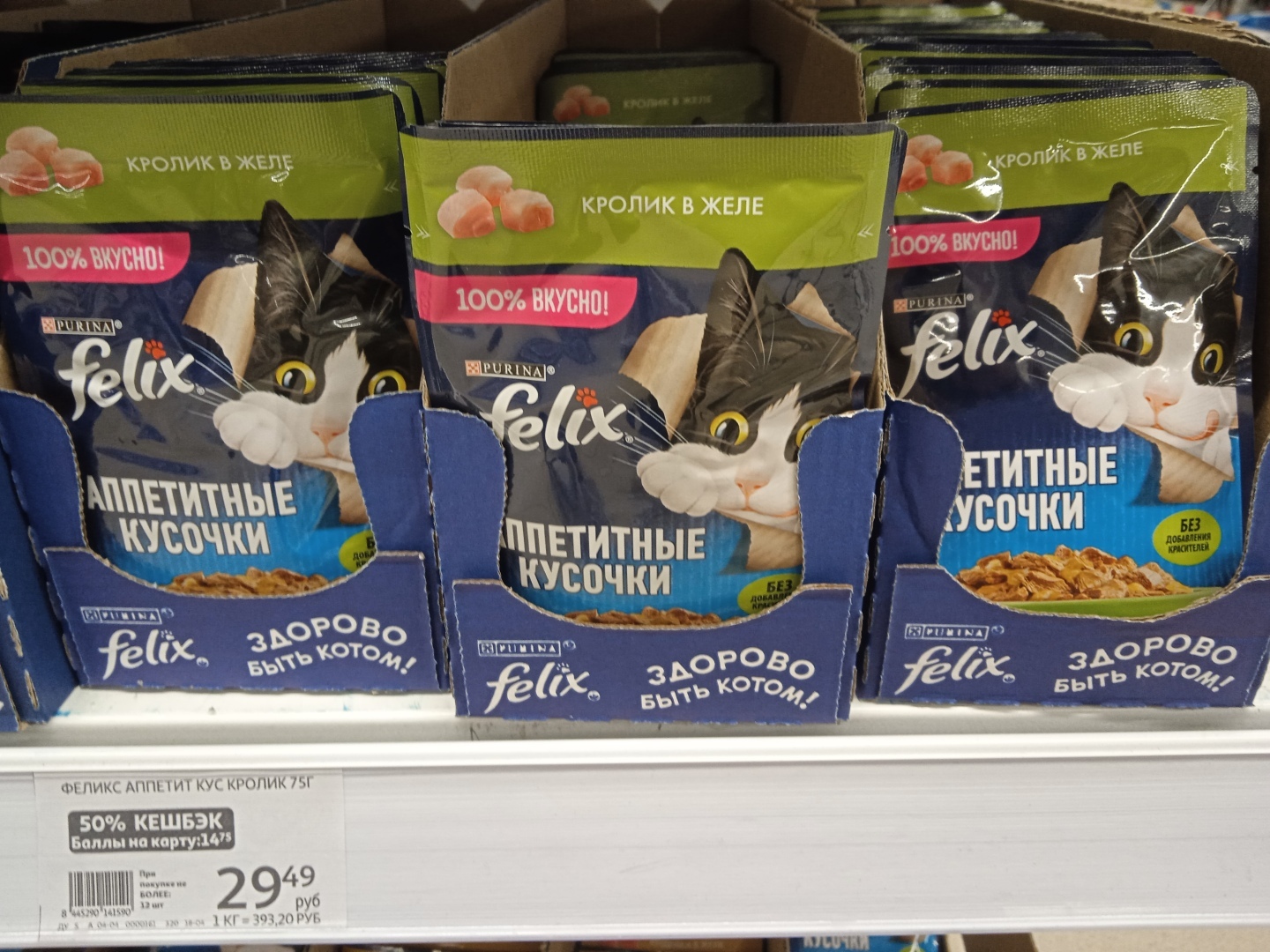 Привлёк меня и кешбэк в 50% на влажный кошачий корм "Феликс". После его применения цена составляет всего 14 рублей 75 копеек за пакетик в 75 грамм. Цена заманчивая, если учесть что последний раз я этот корм покупала по 22 рубля за пакетик. Экономия с единицы данного товара составляет 7,25 рубля.
