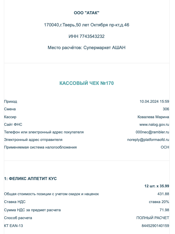Во время моего похода в "Атак" 10 апреля кассир не выдала мне бумажного чека, сообщив что чек электронный. Когда я пришла домой и стала проверять чек, то обнаружила, что пакетик кошачьего корма стоит не 29,49 рубля, а 35,99 руб.