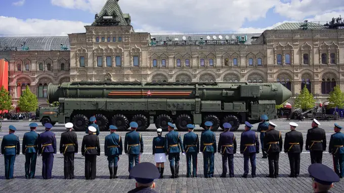 Российский межконтинентальный баллистический ракетный комплекс "Ярс" был запущен во время военного парада в День Победы, приуроченного к 78-й годовщине победы над нацистской Германией во Второй мировой войне, на Красной площади в центре Москвы, Россия, 9 мая 2023 года.