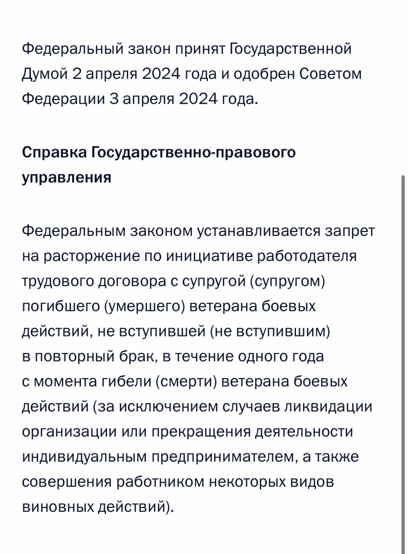Речь идет о федеральном законе от 06.04.2024 70-ФЗ. Теперь ТК РФ дополнен новой статьей 264.1 "Гарантии супруге (супругу) погибшего (умершего) ветерана боевых действий", согласно которой, нельзя увольнять супругов умерших ветеранов боевых действий. На мой взгляд, это хороший и правильный закон, поскольку после известия о смерти погибшего супруга или супруги в зоне СВО при выполнении боевых задач вдове и так морально (психологически) сложно. Материальная поддержка необходима, и в том числе со стороны работодателя, в виде запрета на увольнение. Но, как всегда, у закона есть свои оговорки и нюансы