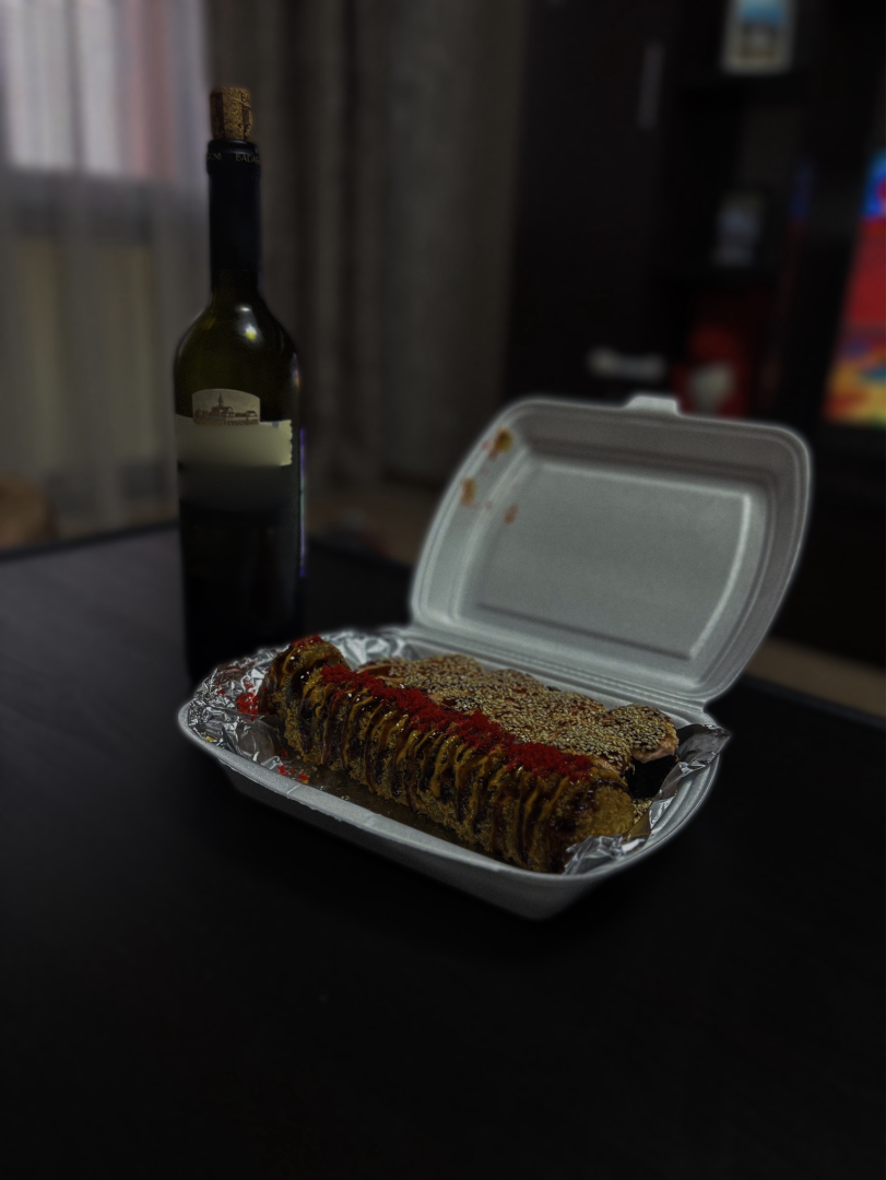 Мы заказали суши-любимое наше с мужем лакомство.А рядом с суши,на столике,красовалась бутылка вина.Мы решили побаловать себя бокалом легкого,терпкого напитка,который идеально дополнял атмосферу вечера.