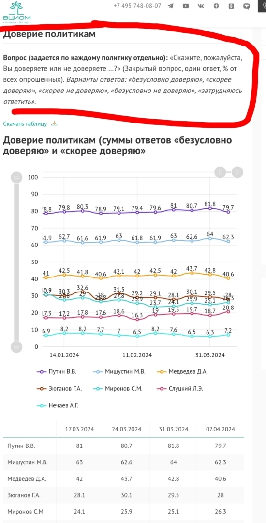 Вопрос (задается по каждому политику отдельно): «Скажите, пожалуйста, Вы доверяете или не доверяете …?» (Закрытый вопрос, один ответ, % от всех опрошенных). Варианты ответов: «безусловно доверяю», «скорее доверяю», «скорее не доверяю», «безусловно не доверяю», «затрудняюсь ответить».