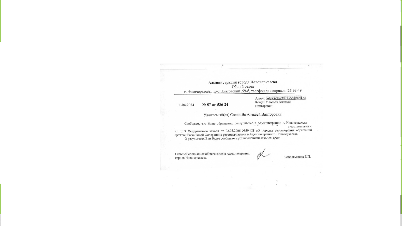 Я написал соответствующее обращение в Администрацию г. Новочеркасска. Теперь жду результат рассмотрения. Может получится. Ведь законом такой вариант предусмотрен. Не поможет, пойду в Прокуратуру и дальше.