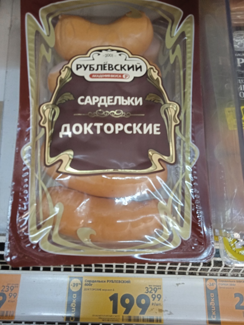 Впервые увидела эти докторские сардельки "РУБЛЁВСКИЕ". Не устояла перед нарисованной на ценнике скидкой, – купила. Ещё не пробовала. Если кто из читателей знаком со вкусом и качеством данного производителя, напишите в обсуждениях свой комментарий, пожалуйста.