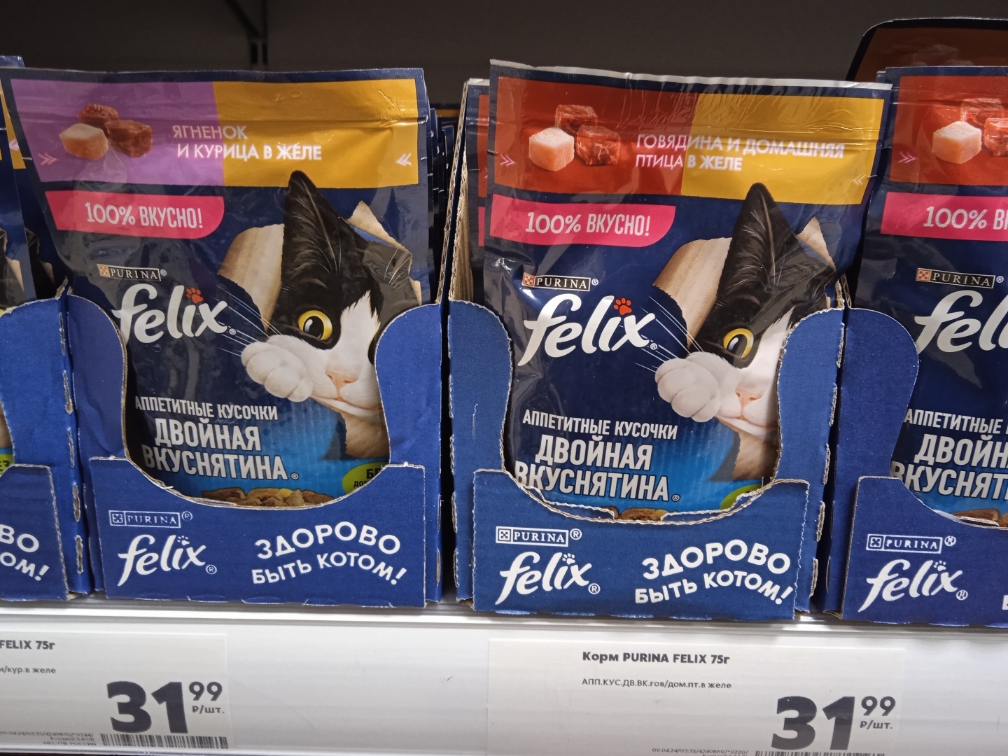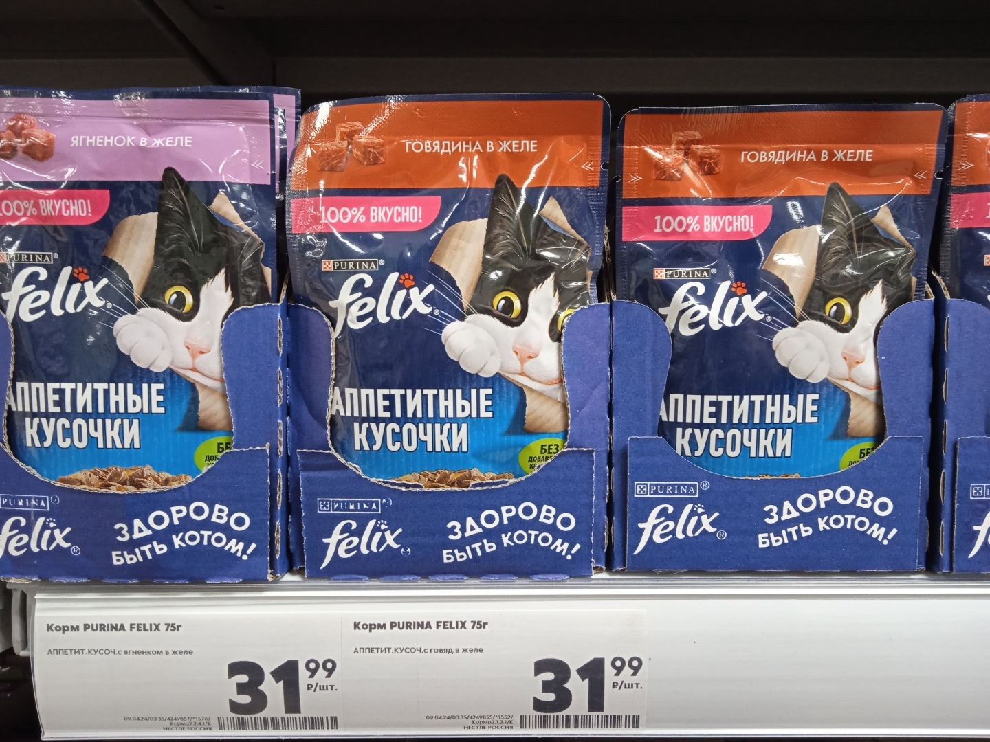 По такой цене как на фото я не буду покупать корм для хвостиков. Дойду до "Светофора". Там сейчас есть в продаже "Феликс" 24 пакетика по 85 грамм с разными вкусами. И цена пакетика выходит дешевле 14 рублей (!).