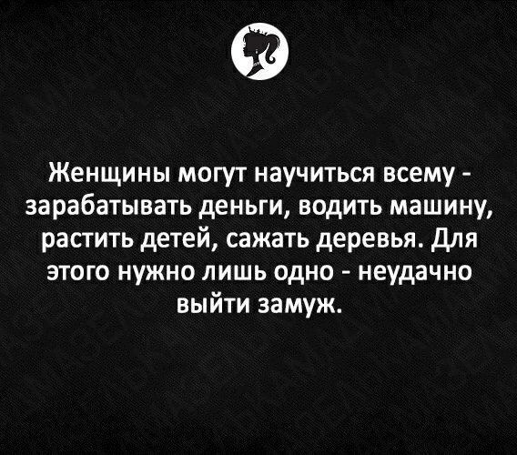 "Речь не про физическую силу, а совсем про другое." Женщина без мужчины никогда не пропадет...Женщины могут научиться всему - зарабатывать деньги, водить машину, растить детей, сажать деревья. Для этого нужно лишь одно - НЕУДАЧНО ВЫЙТИ ЗАМУЖ.