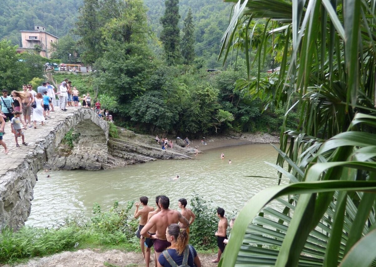Мы не ставили целью ехать в горы, а сынуля очень хотел на море. Но наши соседи по гостевому дому, семья из Питера и из Курска, предложили арендовать минивэн и съездить в туда на экскурсию. Как оказалось, это тоже входило опцией в бизнес Манучара (хозяина дома). А там, в качестве встречающей стороны, была семья двоюродного брата Манучара. Цена за дневную экскурсию (транспорт на целый день с гидом-водителем) была копеечная, 20 лари за одного, это где-то 500 руб. на человека. В общем, без раздумий, мы собрались и утром тронулись в путь.