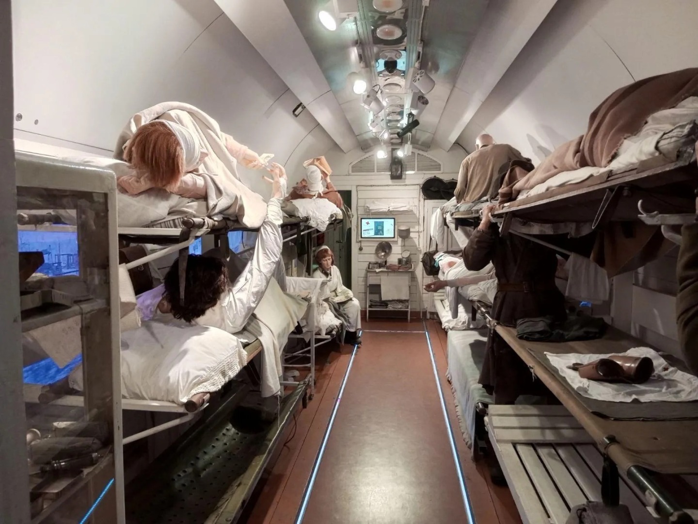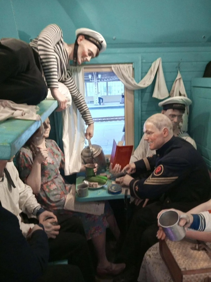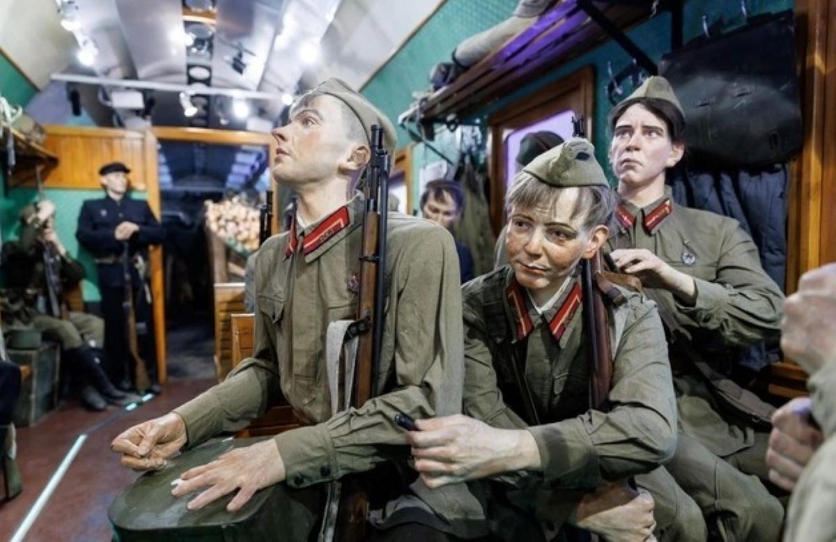 В 10 вагонах поезда воссозданы исторические фрагменты Великой Отечественной войны: от первого дня до победного. Зрелище просто невероятное: словно окунаешься в атмосферу военных событий.