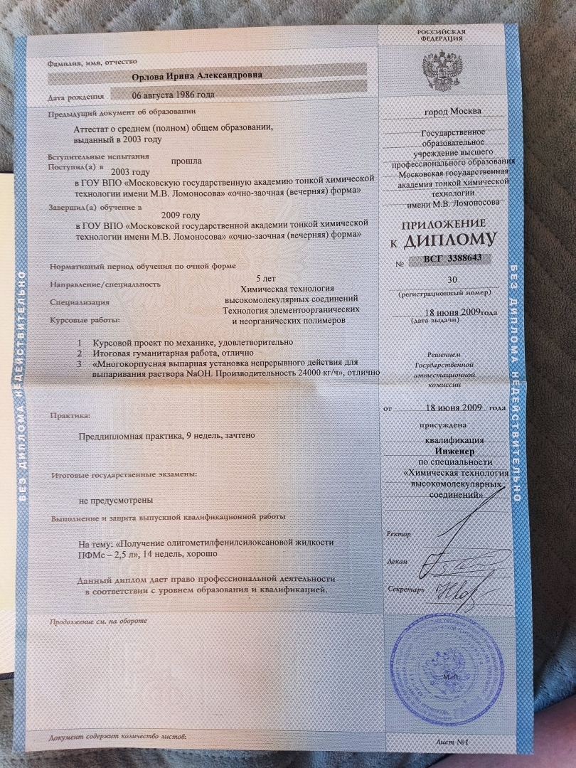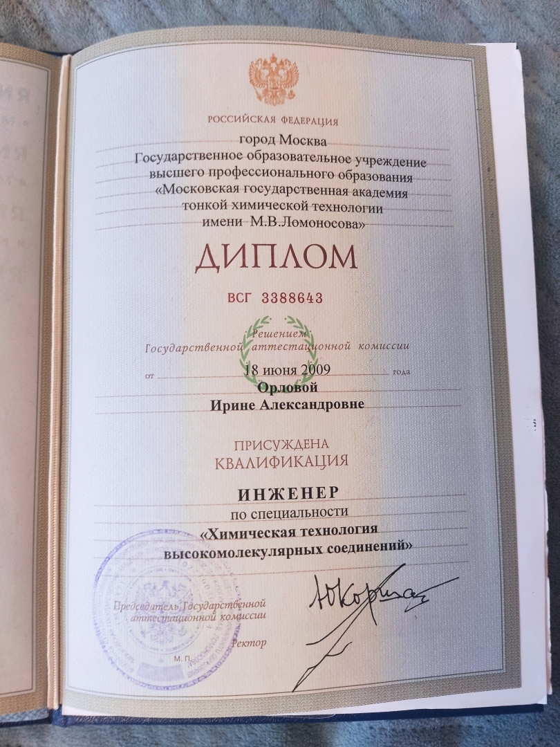 Я принципиально после этих слов поступила именно в МИТХТ им. Ломоносова. Московская государственная академия тонкой химической технологии им. Ломоносова. Бывшие высшие женские курсы, затем второй физфак МГУ, затем институт тонкой химической технологии, академия и ныне в составе МИРЭА как МТУ (технологический университет с химической специализацией). И закончила ведь! По специализации химическая технология элементоорганических соединений. ☝ Специальность в дипломе стоит более общая, специализация более узконаправленная, более тонкая. Не зря же в названии ВУЗа стоит словосочетание тонких химических технологий. 😌 Диплом выдан на девичью фамилию.