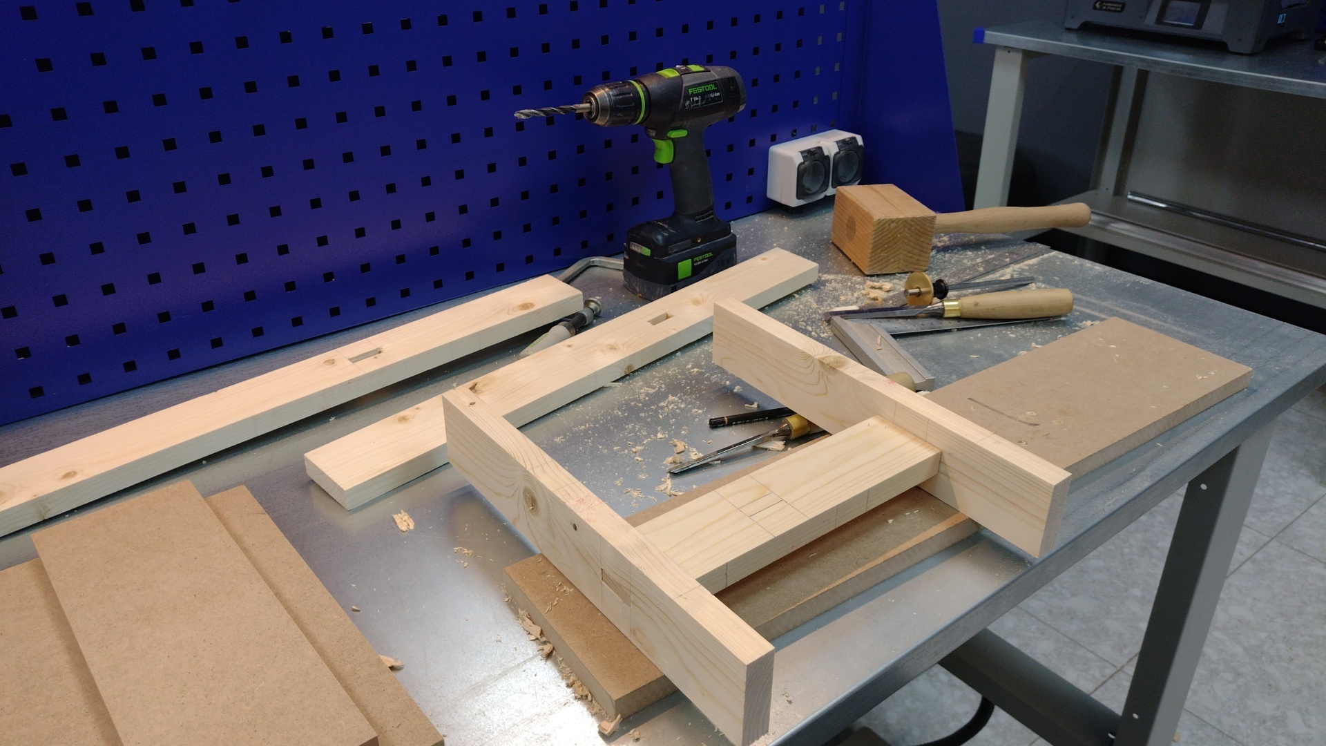 Конкурсное задание в этом году было "изготовление стульчика".Надо отдать должное, нашему куратору, который заранее с моим сыном подготовил необходимые "расходники" а именно напили досочки в размер и изготовили сиденье из МДФ. Это было разрешено правилами.