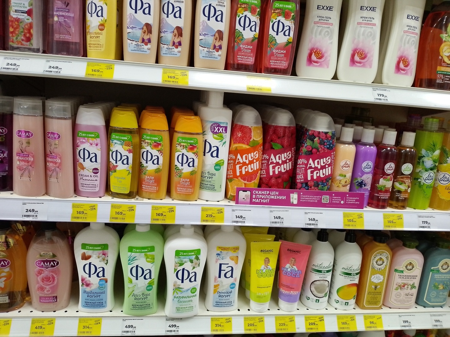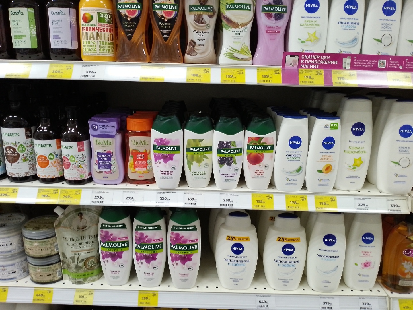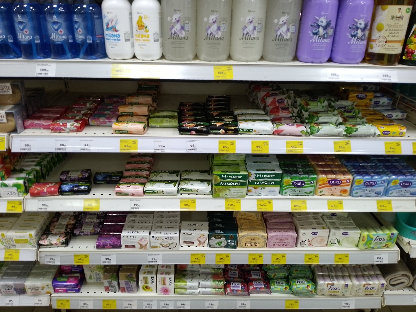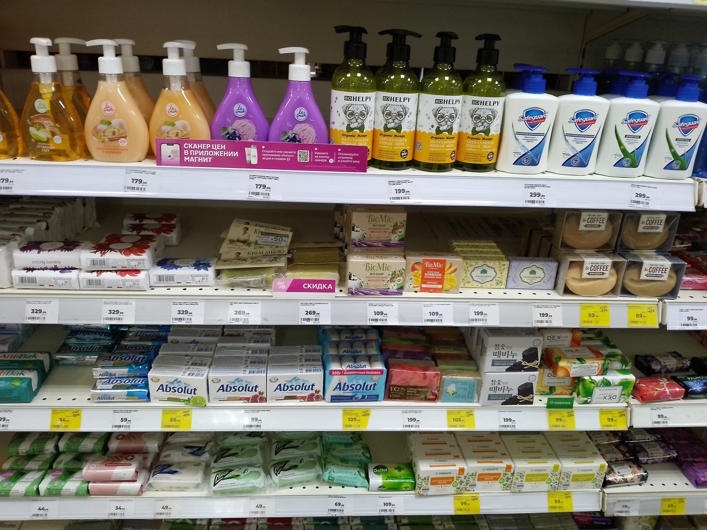 Очень большой выбор различных гелей для душа, шампуней и мыла, единственное, нет мыла "Dove", его сняли с продажи, по всей видимости из-за санкций.