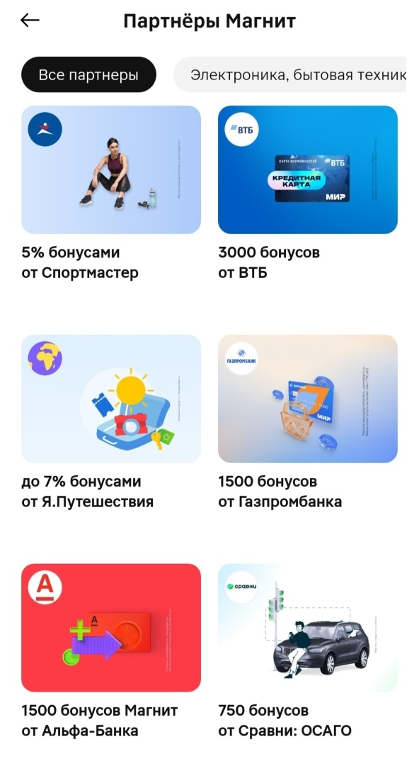 Зашла в приложение, перешла в раздел "Партнёры Магнит" и там перед мной открылось множество интересных карт, за оформление которых, по условиям, мне начислили 3000 баллов на мою карту. Я выбирала в основном дебетовые карты для оформления. Совет от меня: если уж на это подписались, старайтесь оформлять всегда дебетовые карты, их всегда легче закрыть.