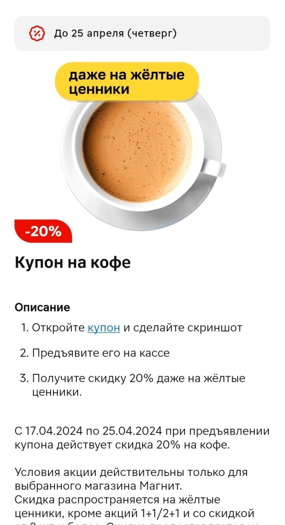 Вчера я проверила на собственном опыте как работают купоны. Я увидела, что появился купон на кофе, но условия были не совсем понятные, до этого я купонами не пользовалась, и всегда думала, что в их применении есть много подводных камней. Но оказалось, что это не так. Мне нужно было лишь проверить, работает ли купон на кофе который высветился у меня. Я взяла небольшой кофе и отправилась на кассу. Я думала, что "ну уж точно скажут, что не тот кофе взяла и на него скидка не подействует", но на моё удивление купон пробился как надо и я получила скидку на кофе в размере 20% от стоимости. Что стало для меня очень приятным бонусом и открытием, что купоны действительно срабатывают на моих покупках.