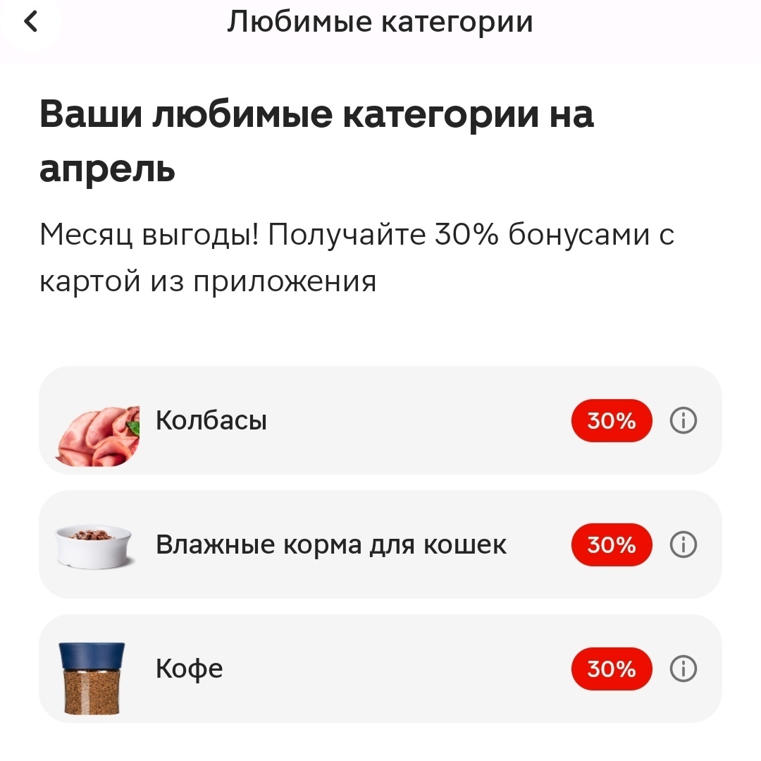 Я зашла в раздел с любимым и категориями и в Апреле мне выпало целых 30% кешбека на кофе. Тем самым кофе, у меня получилось очень экономным. Я думала, раз оно в любимой категории ,то два раза оно под скидку не попадёт, но скидка сработала ,а бонусы вернулись на карту.
