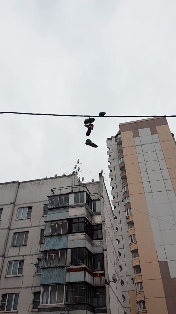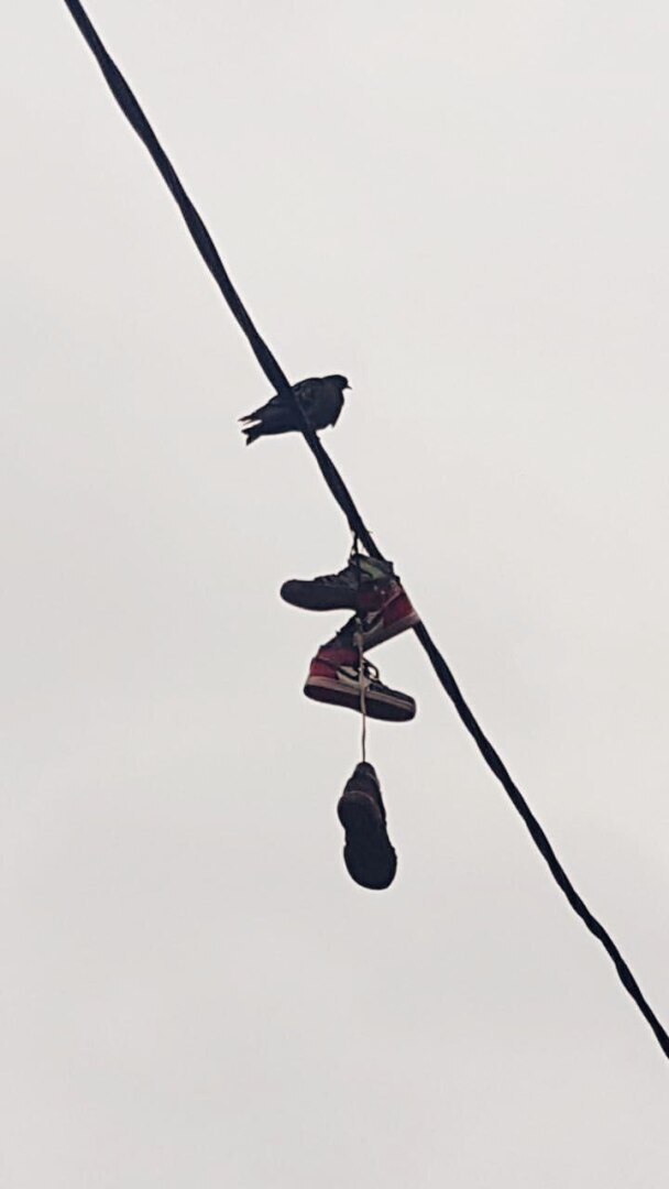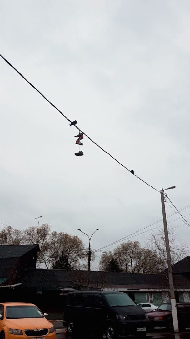 У нас в местной группе спрашивали к чему висит поношенная обувь на проводах. Ответы были разные , в том числе писали что таким образом сообщается о месте связанным с нарушением закона.