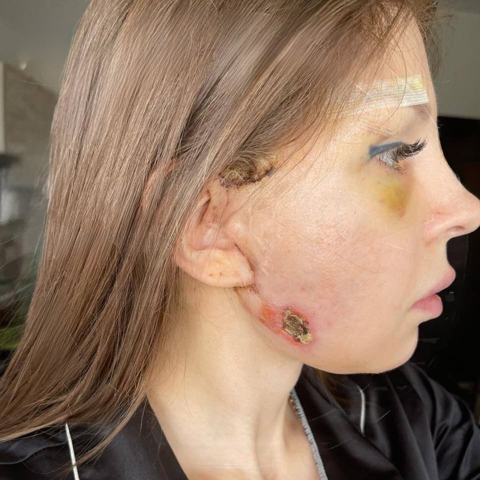 Однако после восьмичасовой операции Екатерина оказалась в ужасном состоянии от боли. Она обнаружила, что её лицо покрыто неровными швами и ожогами. Доктор заверил её, что такие изменения внешности — это нормальное явление после операции.