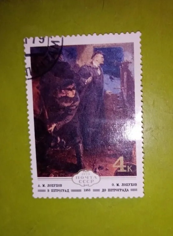 А на марке 1979 года изображена картина художника А.М.Лопухова «В Петроград» (1953 г.)