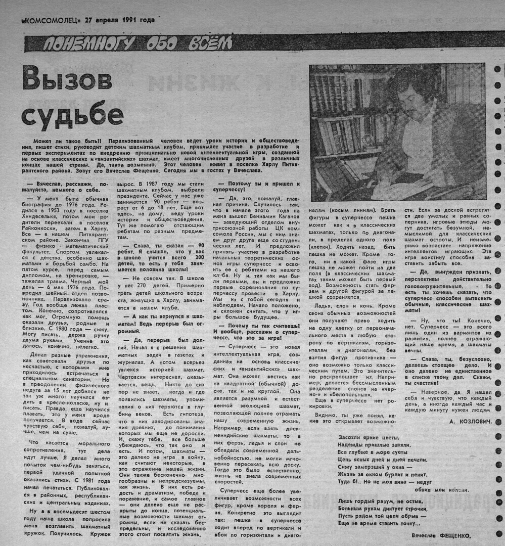 Может ли такое быть?! Парализованный человек ведёт уроки истории и обществоведения, пишет стихи, руководит детским шахматным клубом, принимает участие в разработке и первых экспериментах по внедрению принципиально новой интеллектуальной игры, созданной на основе классический и «византийских» шахмат, имеет многочисленных друзей в различных концах нашей страны. Да, такое возможно. Этот человек живёт в посёлке Харлу Питкярантского района. Зовут его Вячеслав Фещенко. Сегодня мы в гостях у Вячеслава.