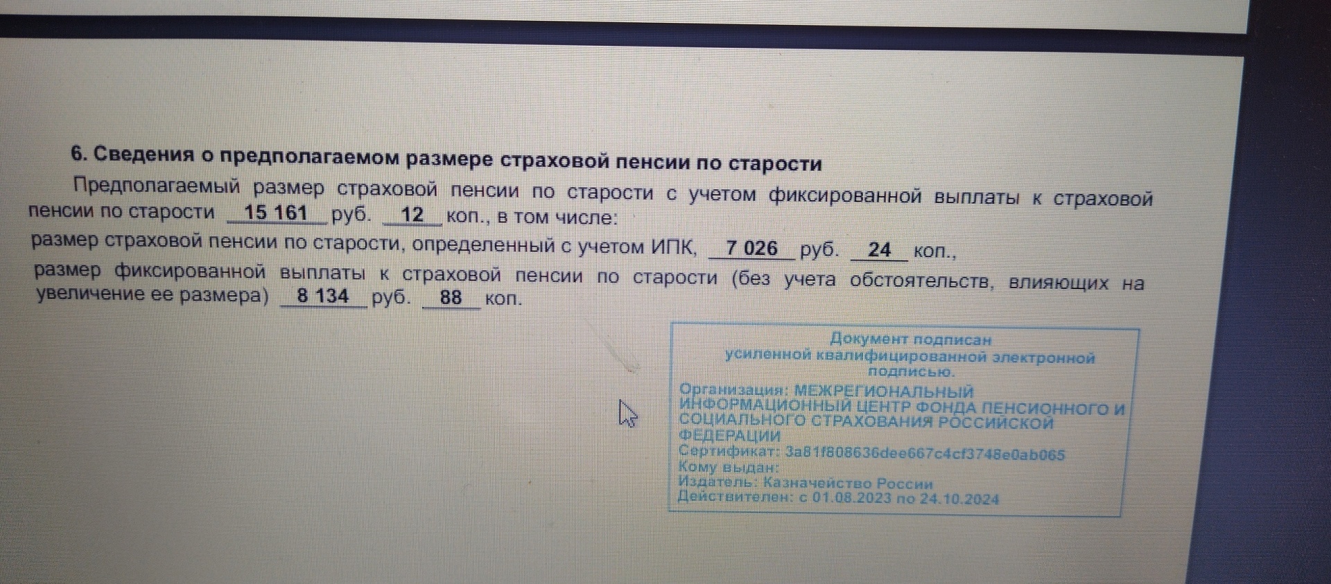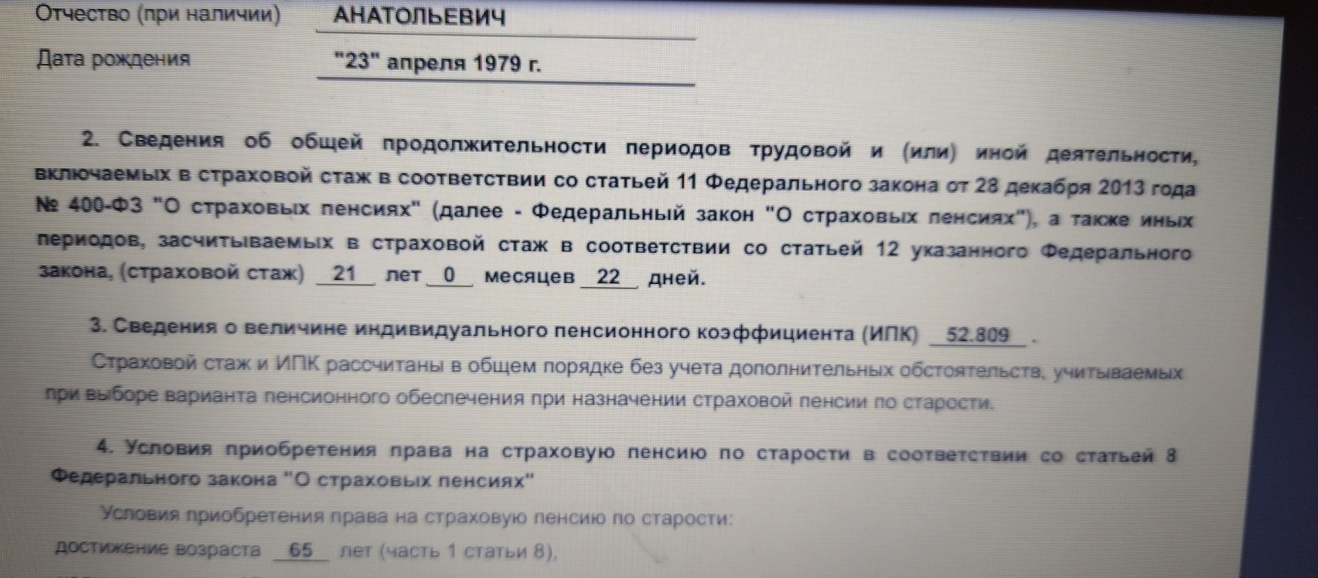 итак из сегодняшнего "письма счастья" можно увидеть, что за 21 год своего трудового стажа я заработал 52 балла. Никаких особых условий труда у меня нет, а это значит что выслуга мне не грозит, и пойду на пенсию , только по старости.