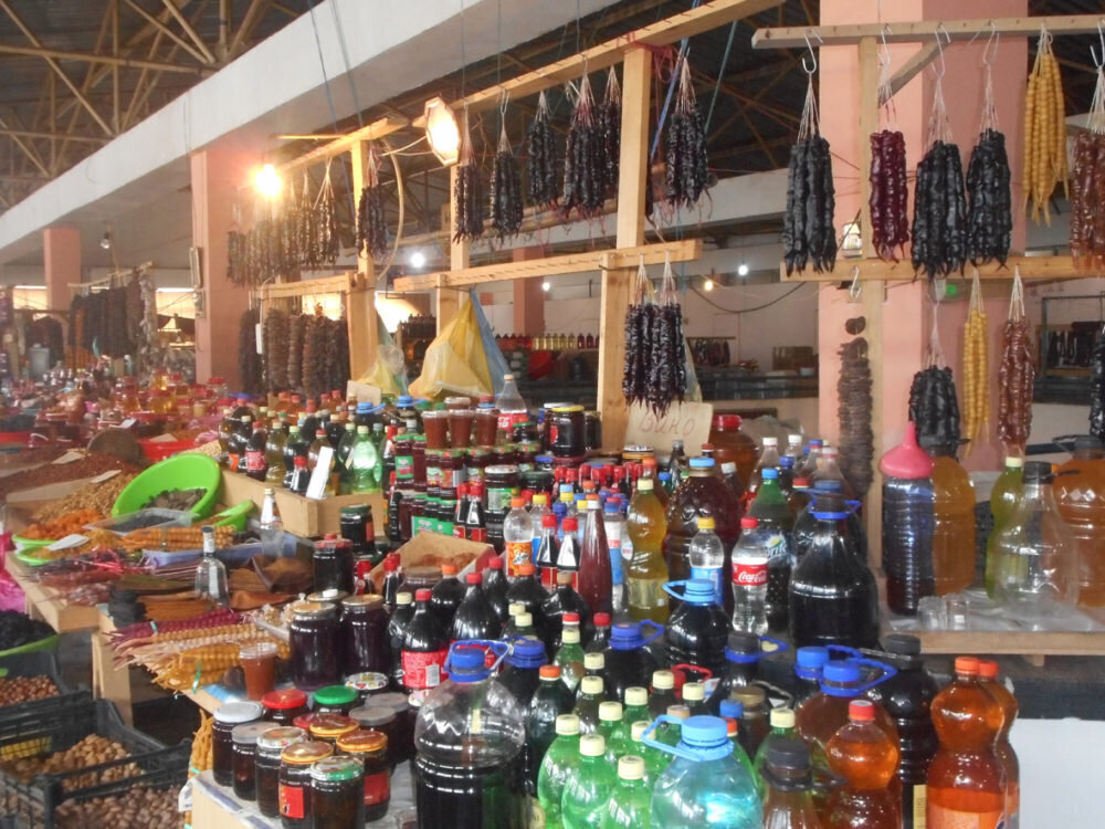 И везде, на всех столах, на всех рядах, свое вино и чача... Напробоваться можно от души!!! В вине я конечно не разбираюсь, не очень люблю. А вот в чаче хорошо разбирается муж, теперь уже бывший. Чача, кстати, обычно продается крепостью не меньше 55-65 градусов. При этом пьется очень легко!