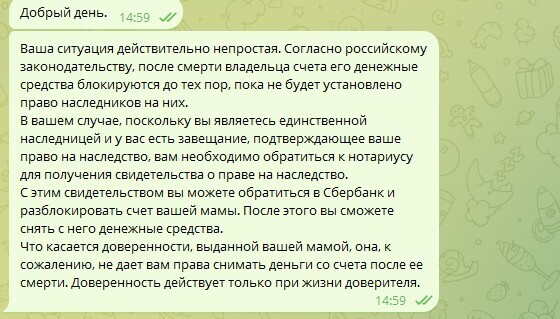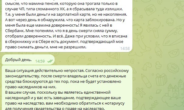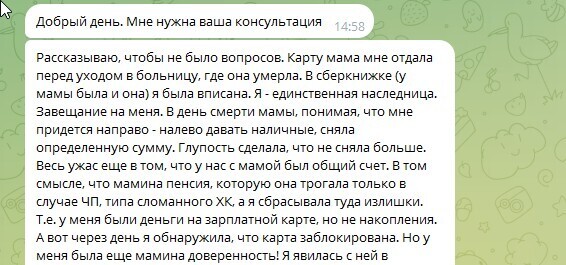 "Рассказываю: карту мама мне отдала перед уходом в больницу, где она умерла. В сберкнижке (у мамы была и она) я была вписана. Я – единственная наследница. Завещание на меня. В день смерти мамы, понимая, что мне придется направо-налево давать наличные, сняла определенную сумму. Глупость сделала, что не сняла больше. Весь ужас еще в том, что у нас с мамой был общий счет. В том смысле, что свою пенсию она трогала только в случае ЧП, типа сломанного ХК, а я сбрасывала туда излишки. Т.е. у меня были деньги на зарплатной карте, но не накопления. А вот через день я обнаружила, что карта заблокирована. Но у меня была еще мамина доверенность! Я явилась с ней в Сбербанк. Мне попеняли, что я в день смерти сняла сумму, отобрали доверенность. И всё. Даже при условии, что я вписана в сберкнижку и в Сбере есть документ, подтверждающий мое право снимать деньги, мне не разрешили".