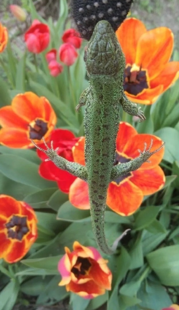 Так вот, надела свои рабочие рукавицы и полезла в клумбу с тюльпанами. Вдруг чувствую, что кто-то прицепился к рукавице. Стала медленно вытаскивать руку и увидела её: маленькую зелёненькую ящерку.