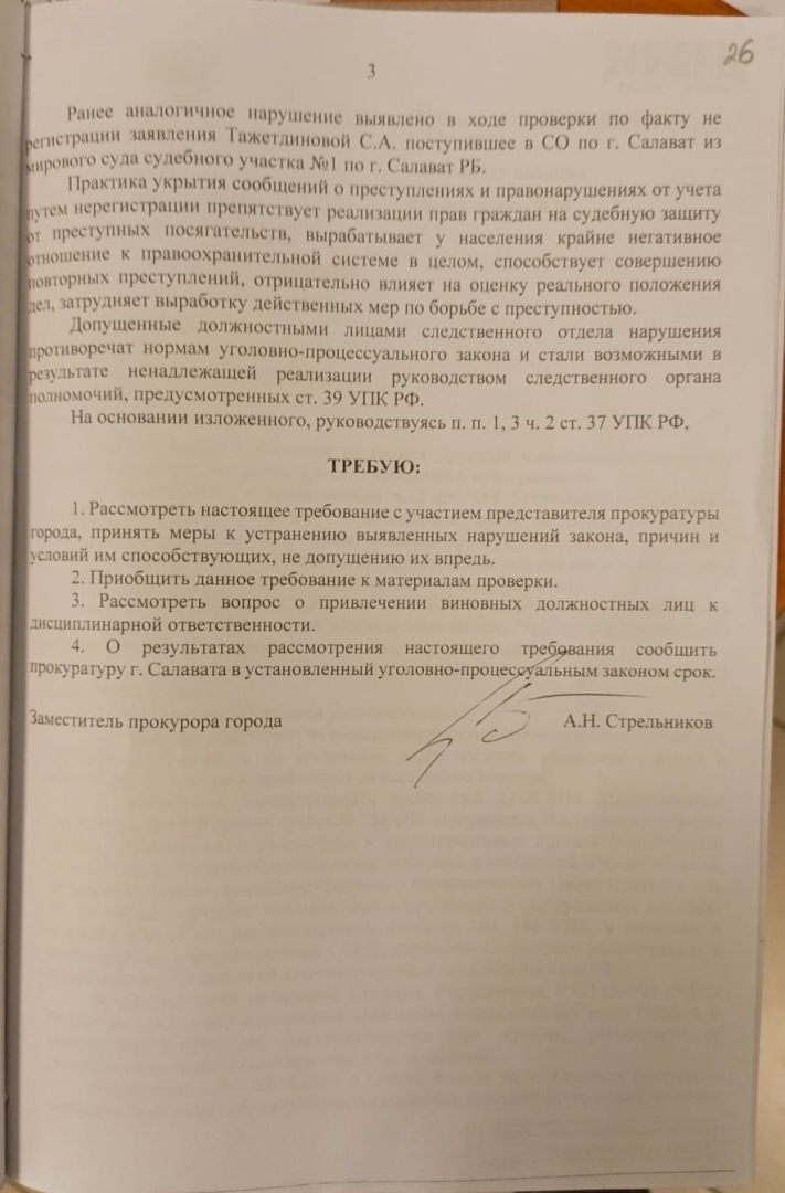 То есть Прокуратура раньше не замечала что СК СУ по городу Салават РБ по заявлению заявителя нарушена была подследственность?