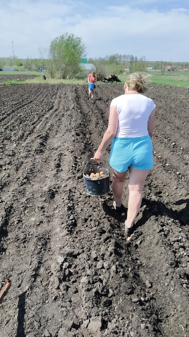 для начала я наделал рядков, в который навозил навоза, надеюсь, что меня не "оштрафуют" на 600 тысяч, благо у нас в деревне всё немного попроще. А в этот момент моя любимая жена натаскала картошки на посадку.