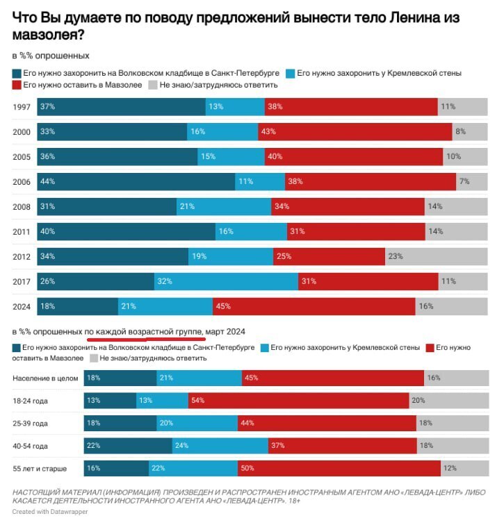 На этот вопрос "Левада-центра***" (признан иноагентом) 45% опрошенных ответили, что Ленина нужно оставить в Мавзолее и 39% выступили за его перезахоронение. При том, что в 97 году этот соотношение составляло 38% к 50%.