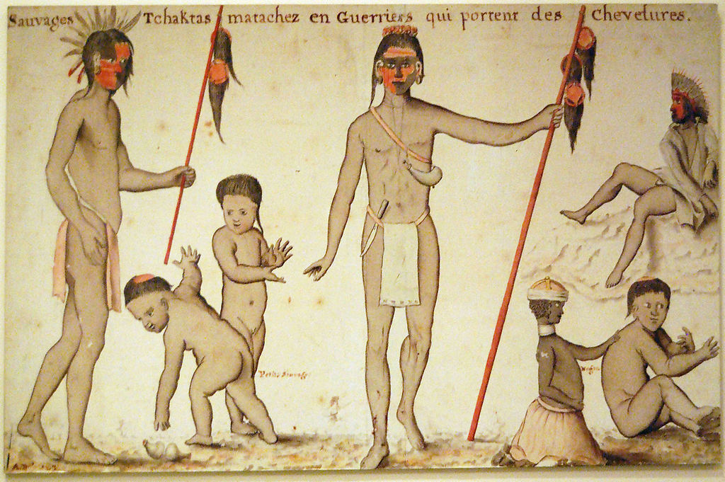 Французы наблюдали обычай снятия скальпов среди коренных американцев еще в 1500-х годах. В 1732 году Александр де Бац изобразил народ чокто Миссисипи со скальпами.