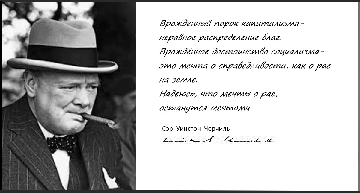 Черчиль был не только професмиональным политиком, но и ее образованным и умным человеком. Так уж его разумом одарила природа. Те слова, которые Вы привели, конечно дают ему надежду на то, что большая часть населения будет только мечтать о социализме, а полностью подчинится правилам, которые установило капиталистическое общество. Человек ведь, ведь часть природы. И он, как и любое животное или растение умеет приспосабливаться к любям условиям. Поэтому капиталисты надеются, что капитализм вечен. И народ привыкнет к тем условиям, которые им предоставит добрые капиталисты. И это сейчас подтверждается нашим современным образом жизни.