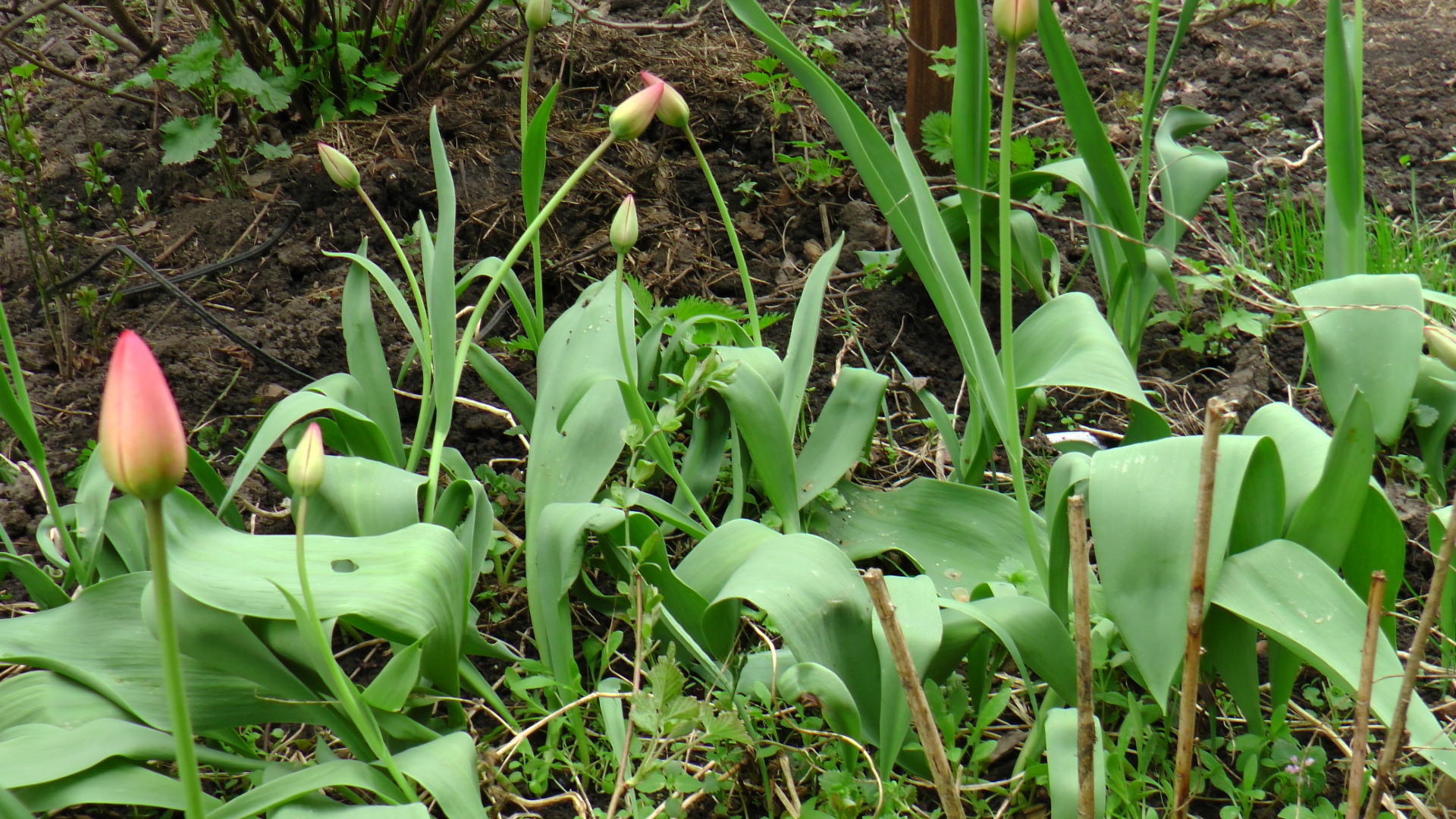 В центре просторного сада располагается уютный цветник, словно оазис красоты среди зелени. Здесь, словно капли радости, цветет небольшая композиция из тюльпанов. Их великолепные цветки манят взгляды, будто созданы для того, чтобы увлечь сердца своей утонченностью и изяществом.