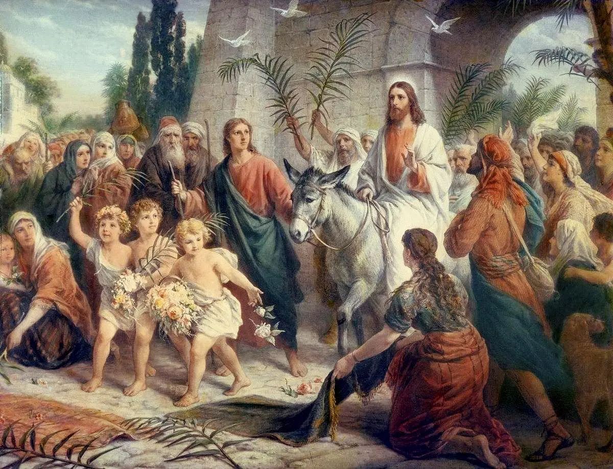 28 апреля-неделя 6-я великого поста Ваий. Время приближалось к празднованию больших праздников, и множество паломников собиралось со всех концов, чтобы войти в Иерусалим с торжеством и радостью. Иисус также решил войти в город торжественно, чтобы подчеркнуть свою славу. Ранее он всегда входил в Иерусалим пешком, но на этот раз он хотел въехать как царь, сидя на осле.