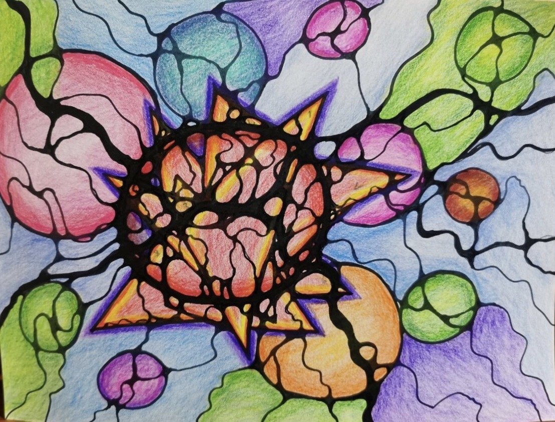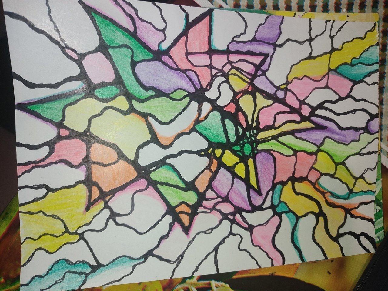 Дальше мы раскрашиваем рисунок. Главное правило - закрашивать минимум 2 ячейки. То есть, наш рисунок делится на много разных пузырьков, вот одним цветом важно закрасить минимум 2 таких пузырьках. Иначе мы расщепляем сознание и путаем мозг.