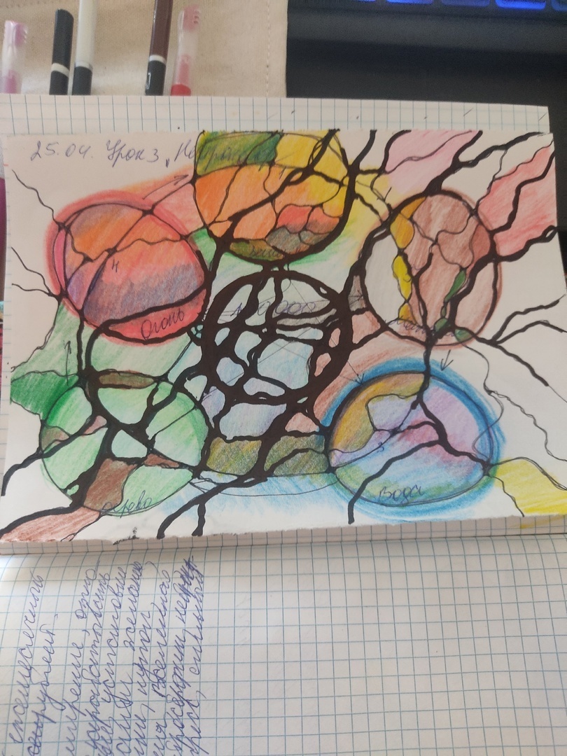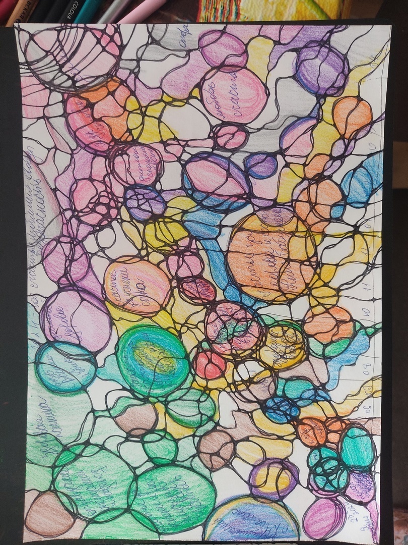 Например, раскрашиваю 3 ячейки. Резко мысли на подругу. Значит, тут какая-то ситуация связана с этим человеком. Надо её приглушить или обострить. Рисую дальше - заболела нога, тут травма. Нужно её " полечить".