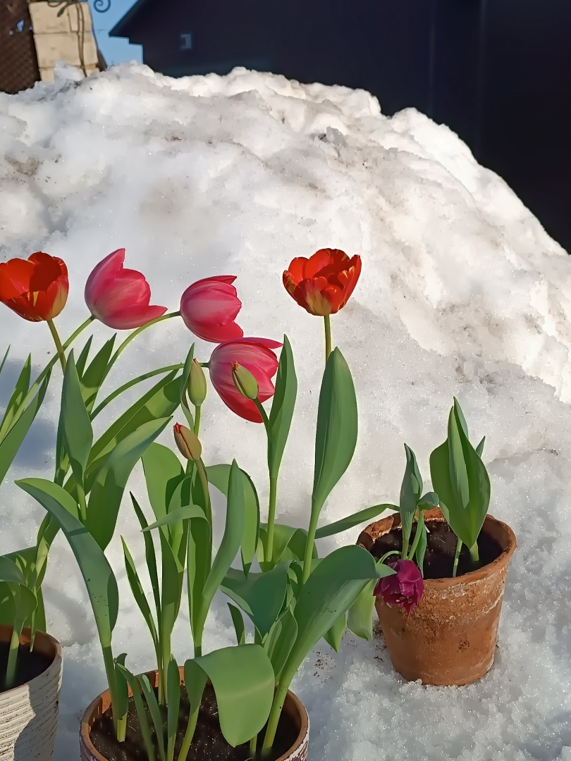 Невероятно красиво, тюльпаны на снегу... только бы корешки не успели подморозить. 🙂