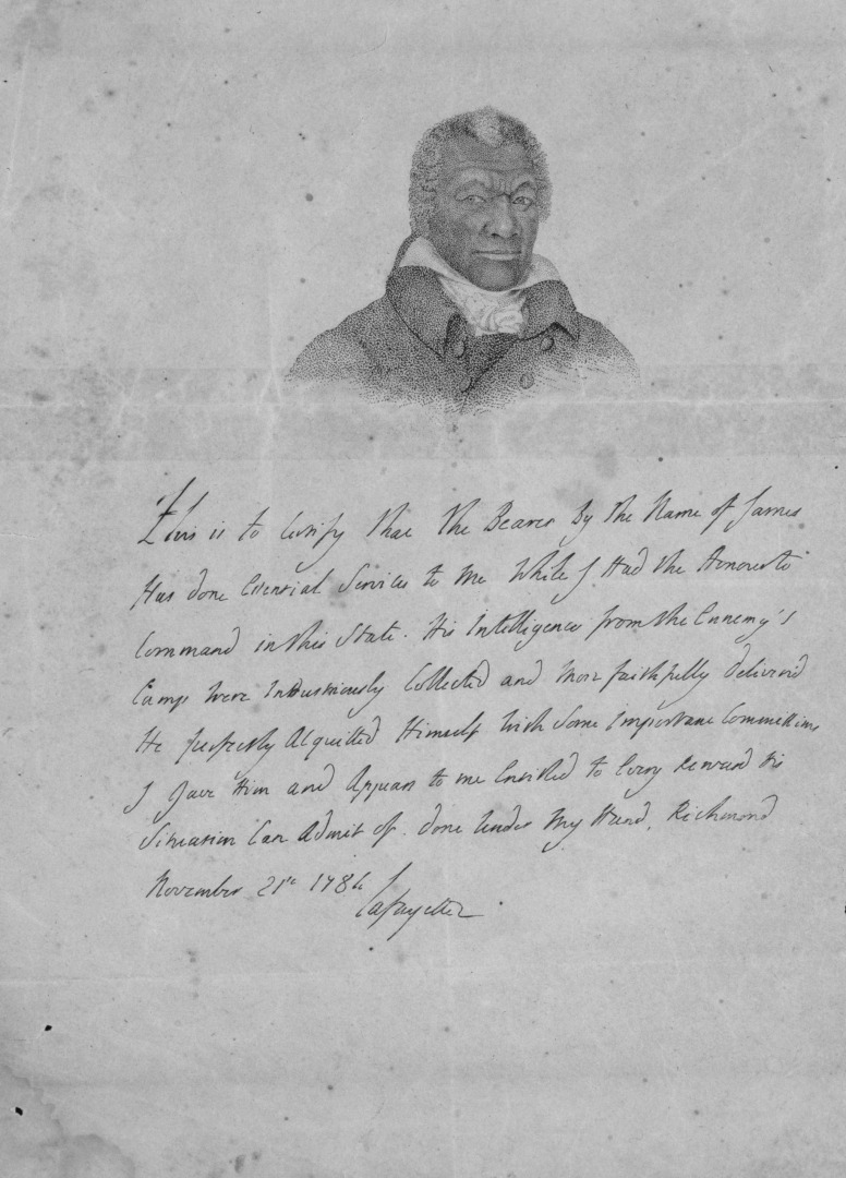 В записке Лафайет написал : «Это подтверждает, что Носитель оказал мне жизненно важные услуги, пока я имел честь командовать в этом штате. Его разведданные из вражеского вражеского лагеря были тщательно собраны и доставлены самым верным образом. Он прекрасно справился с некоторыми важными поручениями, которые я ему поручил, и, как мне кажется, имеет право на любую награду, какую только может себе позволить его положение».