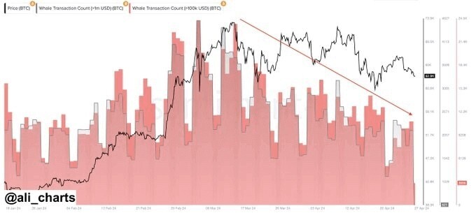 Эксперт в криптосообществе Али Мартинес отметил значительное снижение активности биткоин-китов с середины марта, предполагая, что всплеск транзакций криптокитов может стать ключевым катализатором для возобновления покупательского интереса к биткоину. Киты – это крупные игроки на рынке криптовалют, способные оказывать значительное влияние на цену актива. Их активность и поведение могут служить индикатором того, как будет развиваться ситуация на рынке. По словам Мартинеса, возвращение криптокитов на рынок может стимулировать новые инвестиции и способствовать росту цены биткоина. Наблюдение за действиями крупных игроков может быть важным инструментом для инвесторов, следящих за динамикой крипторынка.