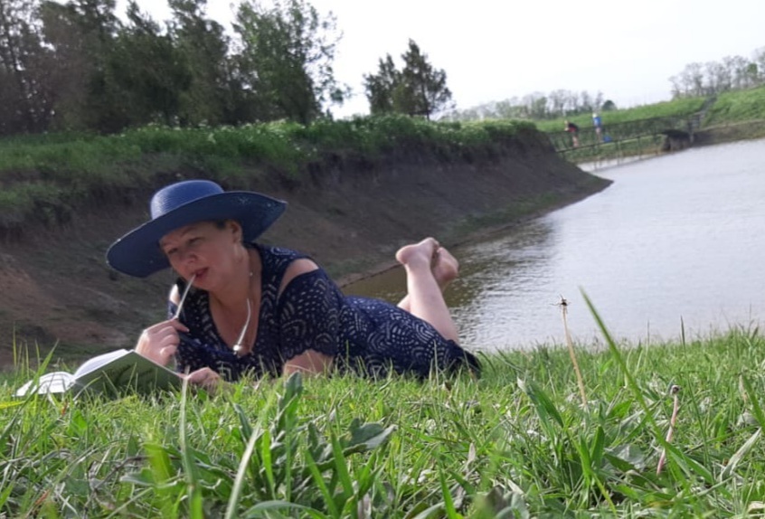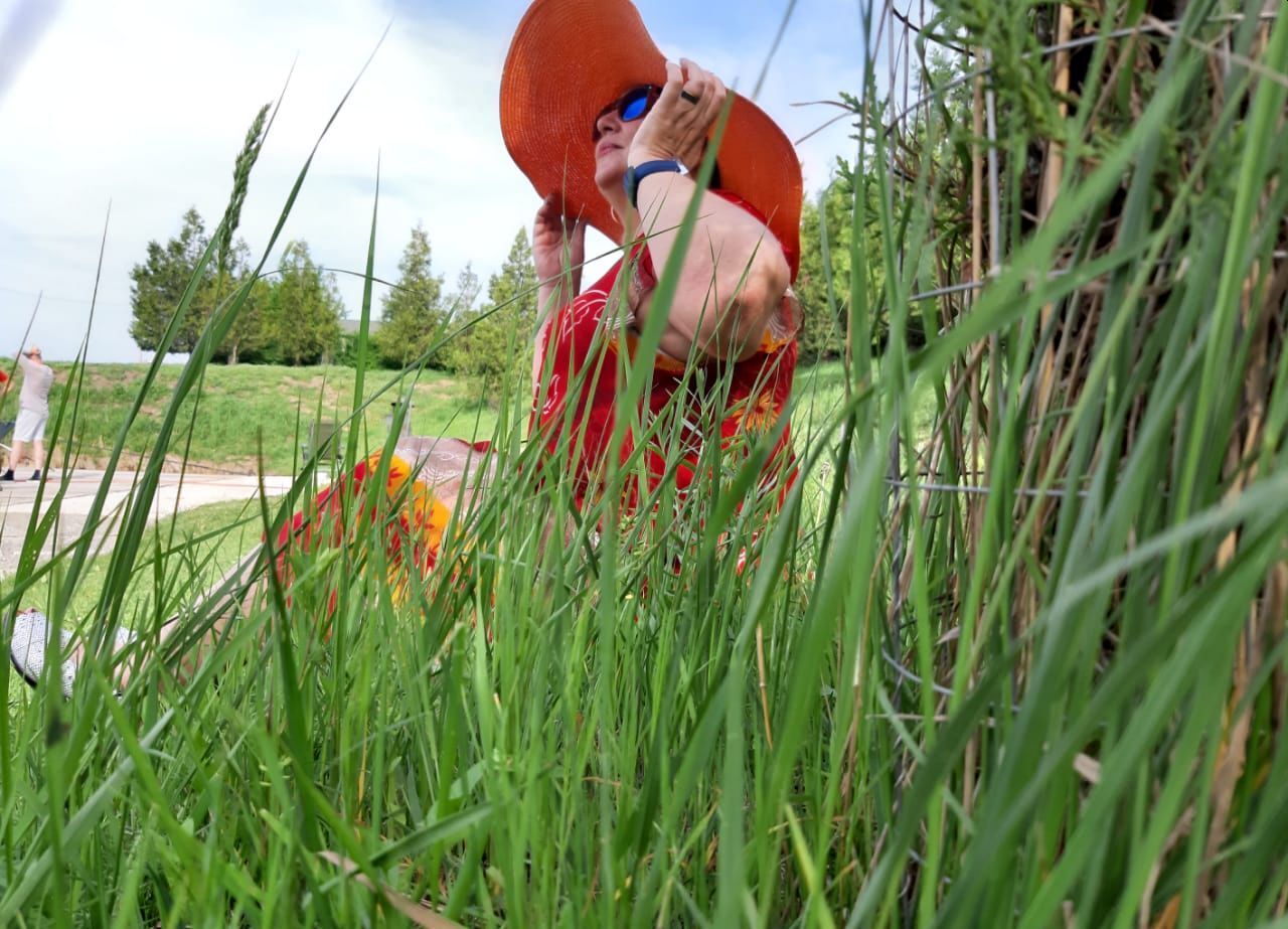 После прогулки, я переоделась в синее платье и надела такую же шляпу, и мы начали меня фотографировать. На озере были рыбаки, так они поставили удочки на подставки, и наблюдали за нашим процессом.