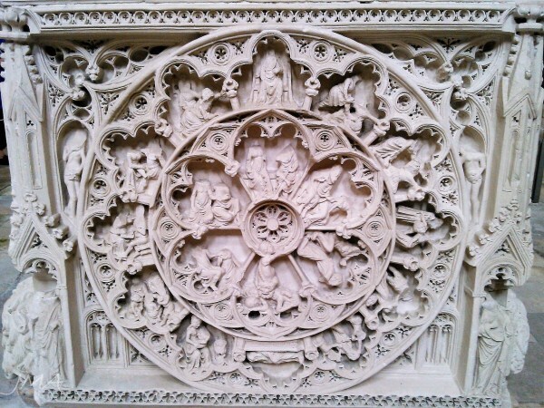 Деревянная дверь готического собора во французском Бове . Рельефы сохранились целыми, но у некоторых фигур были отрублены головы.