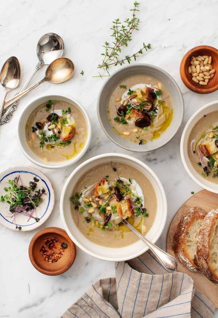 3. Тушите без крышки 20 минут, или пока цветная капуста не станет очень мягкой. Переложите суп в блендер, добавьте горчицу, уксус и взбейте до однородности. Если суп получился слишком густым, добавьте в блендер немного горячей воды, чтобы добиться кремообразной консистенции. Если требуется, приправьте по вкусу солью и перцем и можно подавать с гренками и свежей зеленью.